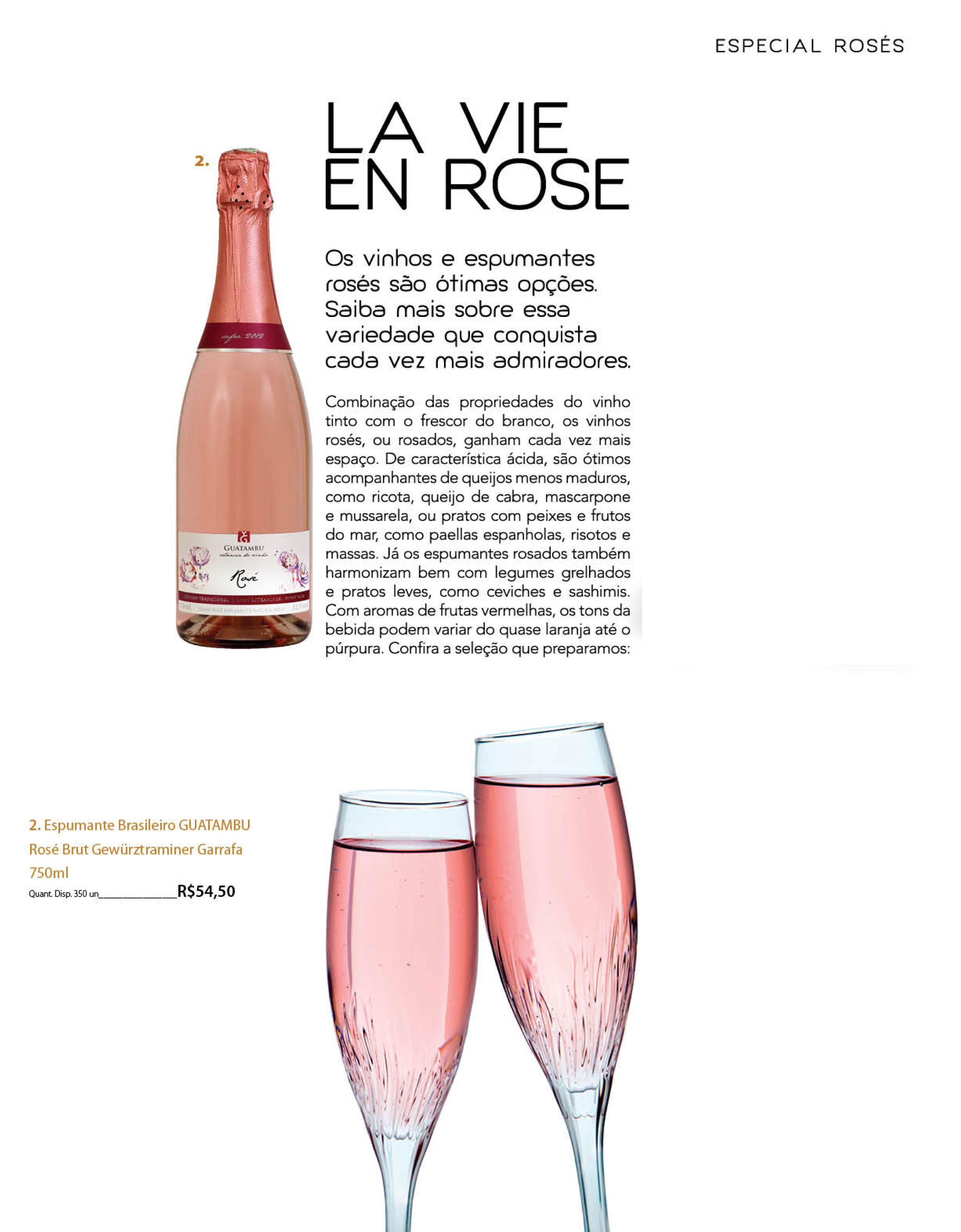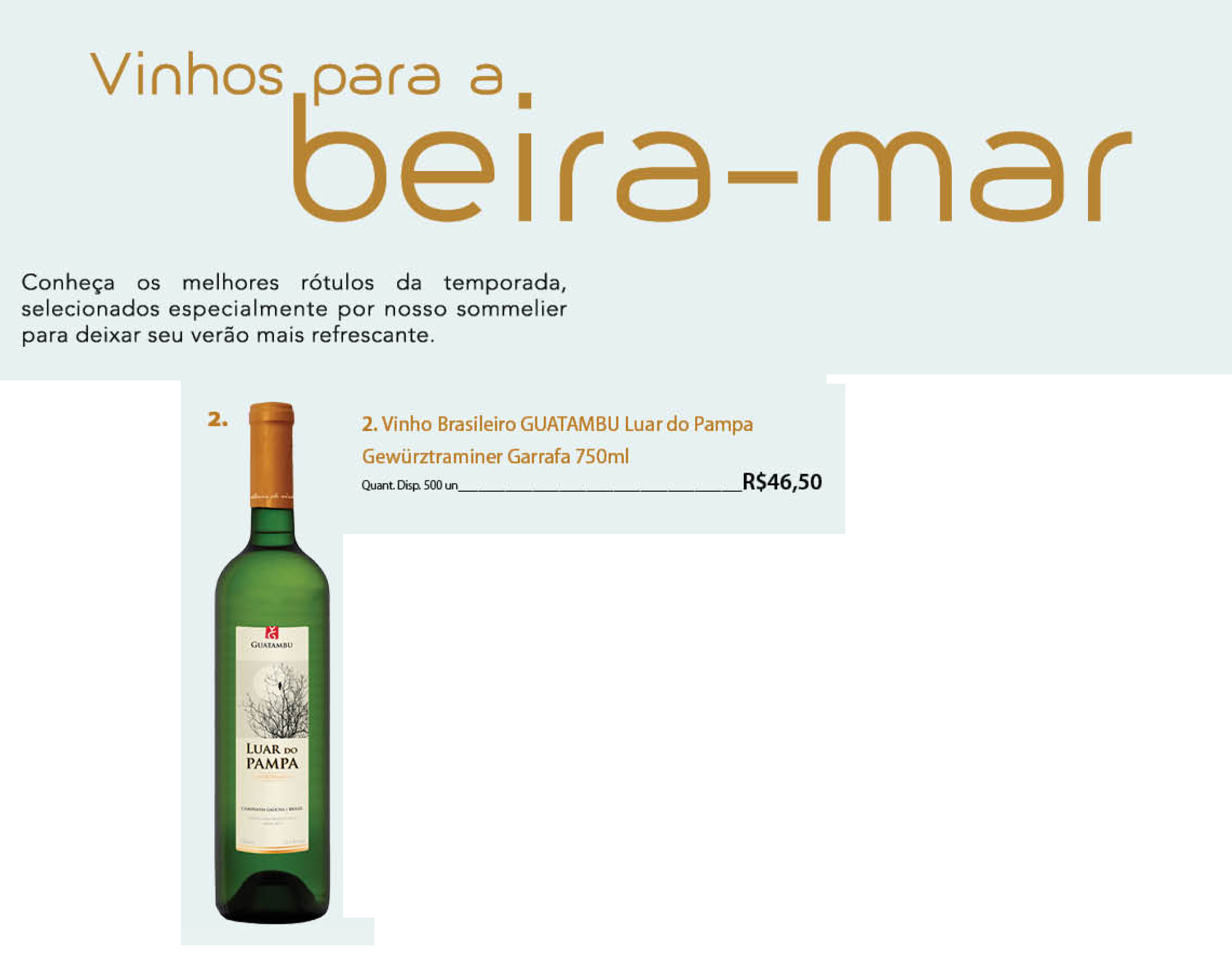 Na ocasião, a Guatambu disponibilizará os vinhos Rastros do Pampa Cabernet Sauvignon – Medalha de Ouro no 6º Concurso Internacional “Emozioni dal Mondo” (Itália), Medalha de Prata no V e VI Concurso Internacional de Vinhos do Brasil, selecionado em 2010, 2011 e 2012 para o Projeto do Ibravin “Para saber o sabor dos vinhos do Brasil”, selecionado entre os 16 vinhos mais representativos da XX Avaliação Nacional do Vinhos, safra 2012 –, Rastros do Pampa Merlot e Luar do Pampa Gewürztraminer.