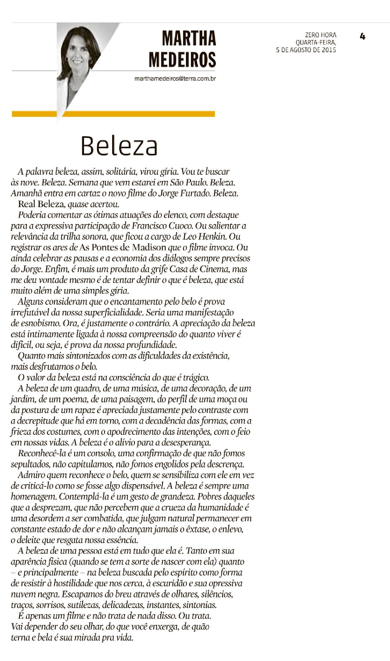Martha Medeiros é colunista dos jornais O Globo e Zero Hora e autora de 26 livros, entre eles “Divã”, “Feliz por Nada”, “Doidas e Santas” e o recente “Quem diria que viver ia dar nisso”. Tem textos adaptados para teatro e cinema, parcerias musicais com Frejat, Nenhum de Nós e Jota Quest, e um canal no YouTube chamado M de Martha.