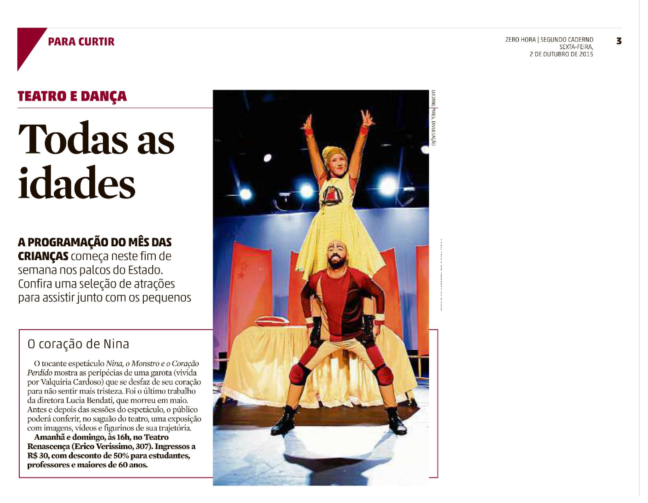 Nos dias 03 e 04 de outubro, a Clareira de Teatro, companhia fundada pela diretora e atriz Lúcia Bendati, falecida em maio deste ano, promove uma programação especial em homenagem à artista, que completaria 48 anos no dia 24 de outubro. Estão programadas para o final de semana duas apresentações do espetáculo Nina, o Monstro e o Coração Perdido, último trabalho de Lucinha, no Teatro Renascença. O público também poderá conferir, no saguão do Centro Municipal de Cultura, uma exposição com imagens, vídeos e figurinos que marcaram a trajetória da artista.