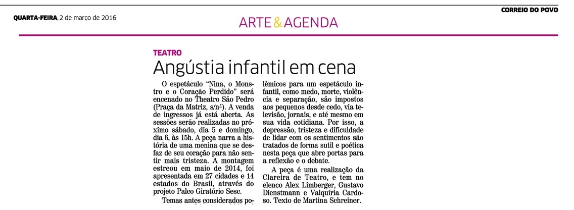 O espetáculo “Nina, o monstro e o coração perdido” tem duas apresentações nos dias 05 e 06 de março, no Theatro São Pedro. A peça conta a história de uma menina que se desfaz do seu coração para não mais sentir tristeza. É um texto delicado, que fala sobre a necessidade de lidar com os sentimentos.