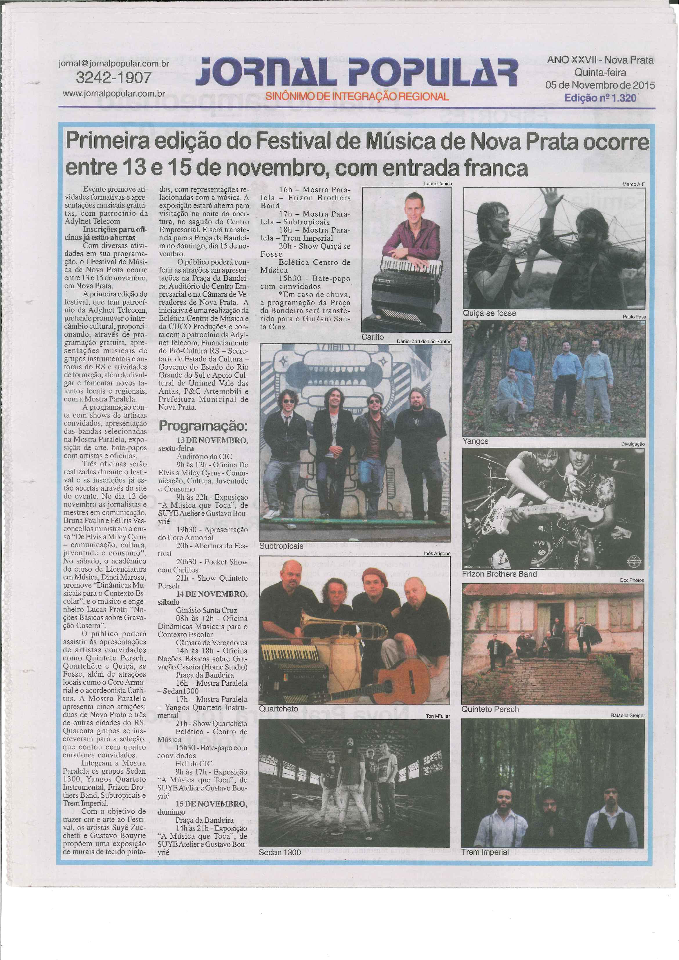 O público poderá assistir às apresentações de artistas convidados como Quinteto Persch, Quartchêto e Quiçá, se Fosse, além de atrações locais como o Coro Armonial e o acordeonista Carlitos. A Mostra Paralela apresenta cinco atrações: duas de Nova Prata e três de outras cidades do RS. Quarenta grupos se inscreveram para a seleção, que contou com quatro curadores convidados. Integram a Mostra Paralela os grupos Sedan 1300, Yangos Quarteto Instrumental, Frizon Brothers Band, Subtropicais e Trem Imperial.