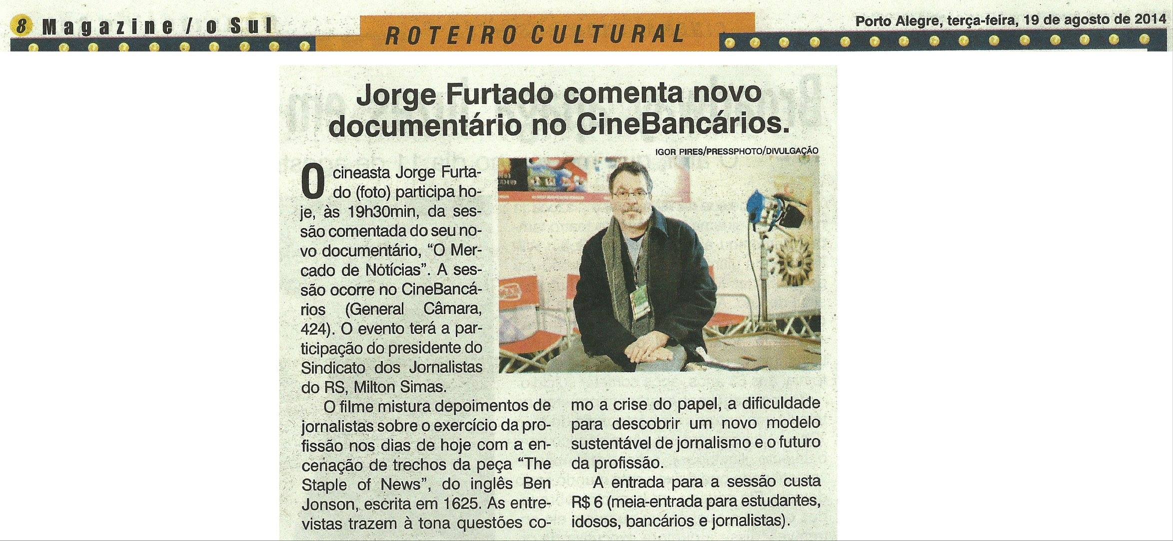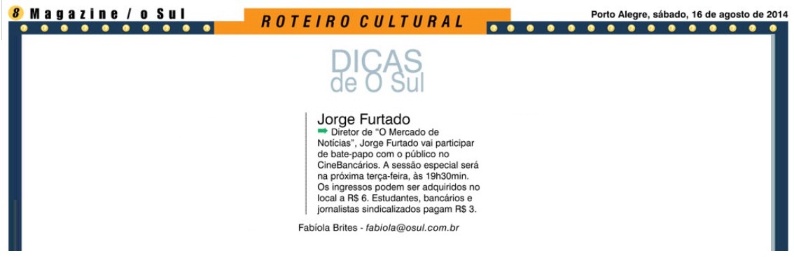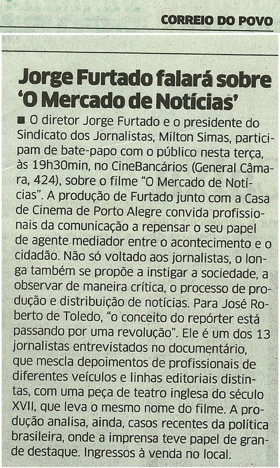 Está disponível no site da Casa de Cinema de Porto Alegre (http://casacinepoa.com.br/loja/mdn) o DVD do documentário O Mercado de Notícias, com roteiro e direção de Jorge Furtado. A produção estreou nas salas comerciais em agosto desse ano, seguindo dez semanas em cartaz em 13 cidades.