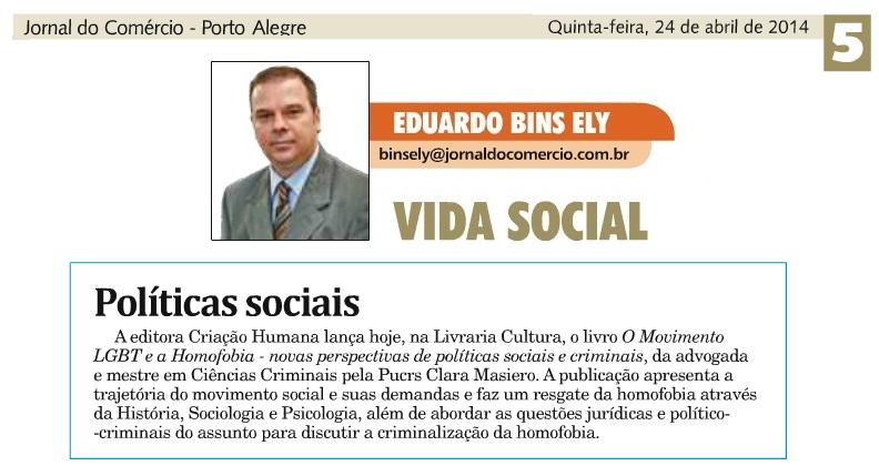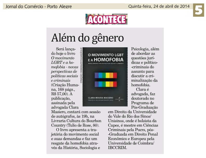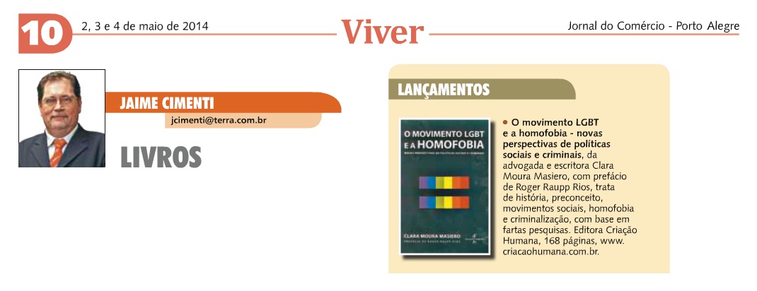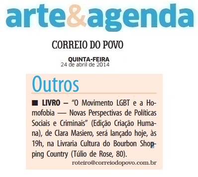 A editora Criação Humana lança no dia 24 de abril, às 19h, na Livraria Cultura o livro “O Movimento LGBT e a Homofobia – novas perspectivas de políticas sociais e criminais”, da advogada e Mestre em Ciências Criminais pela PUCRS, Clara Masiero.