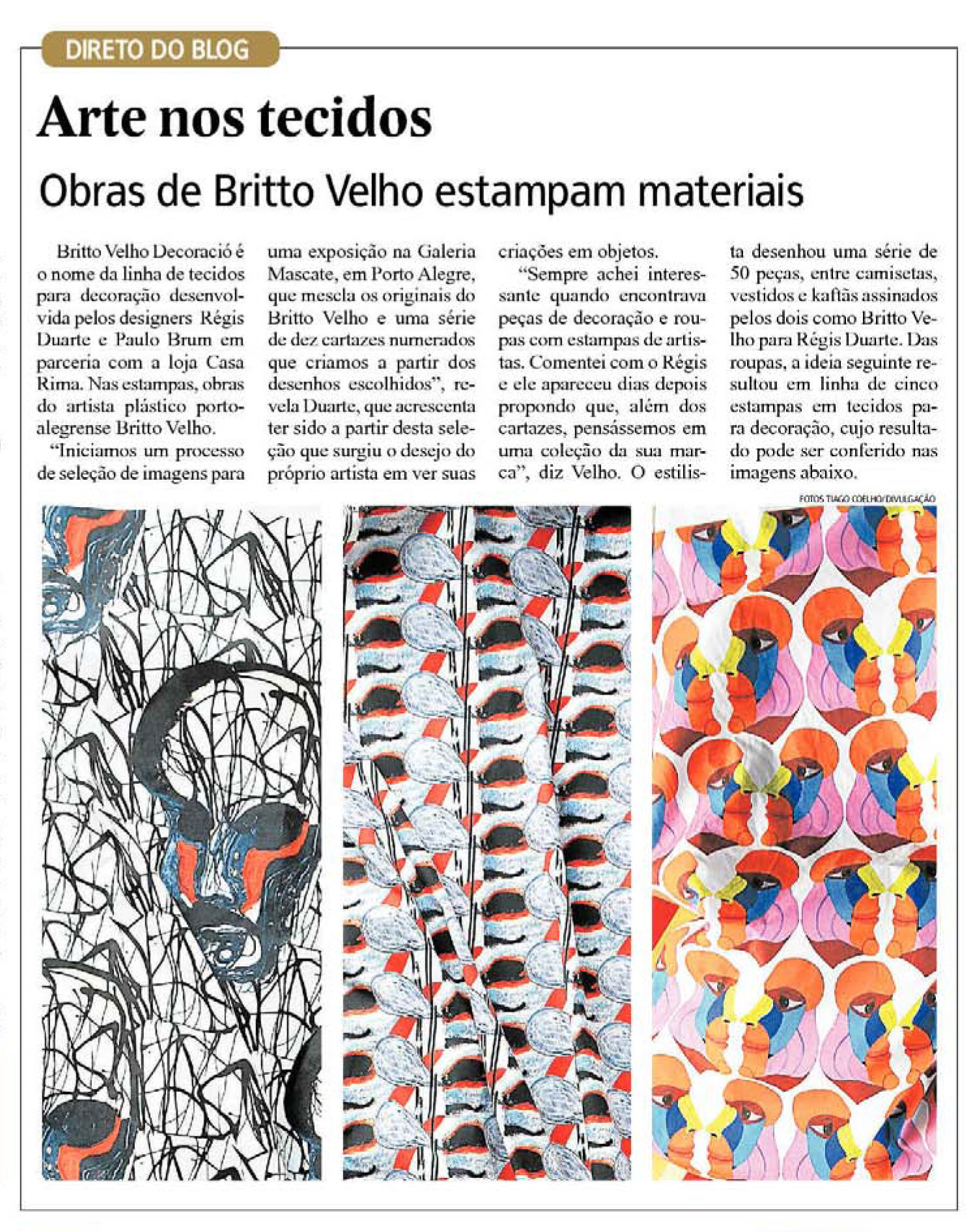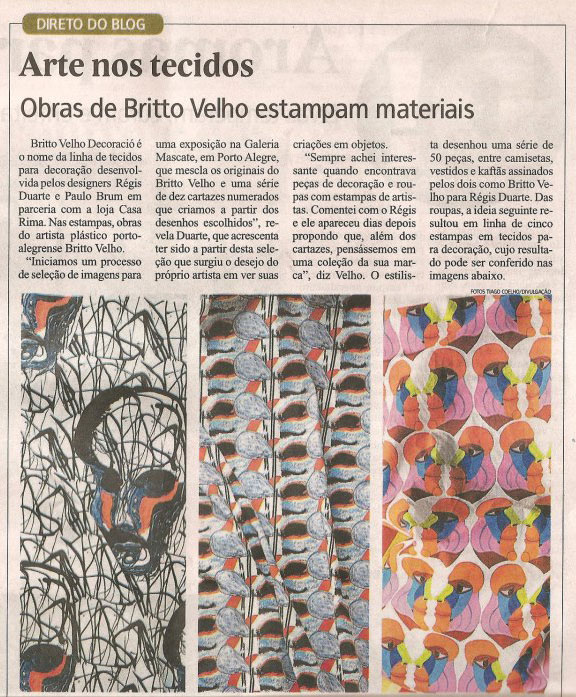 Não é de hoje que designers se apropriam de obras de arte para criar objetos com imagens célebres em museus e galerias. Inspirados nessa tendência, Régis Duarte e Paulo Brum criaram em parceria com a Casa Rima uma linha de tecidos para decoração com estampas de obras de Britto Velho, chamada Britto Velho Decoració. “Iniciamos um processo de seleção de imagens para uma exposição na Galeria Mascate, que mescla os originais do Britto e uma série de dez cartazes numerados que criamos a partir dos desenhos escolhidos”, revela Duarte.