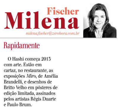 O estilista lança no mesmo dia a coleção Britto Velho por Régis Duarte, com camisetas, vestidos e kaftãs assinados pelos dois artistas. A abertura da exposição acontece a partir das 19h e a mostra segue em cartaz até o dia 19 de janeiro, com entrada franca. Além da inauguração no local, o Hashi Art Cuisine de Luciane Scherer e do chef Carlos Kristensen recebe um apêndice da mostra com um ambiente composto com poltronas e almofadas com tecidos da linha e cartazes da coleção. A Galeria Mascate fica na rua Laurindo, 332.