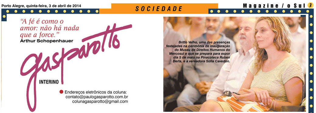 Sinto o mesmo orgulho que acredito tenha sentido o nosso querido Erico quando dizia: “Moro numa cidade que tem Orquestra Sinfônica”. Pois eu “Moro numa rua que tem um pintor!” O Britto Velho ilumina minhas manhãs. Sempre que passo pelas janelas do seu atelier, vejo o mestre pintando, concentrado. Suas personagens exóticas e coloridas carregam uma teatralidade absurda, onde estão presentes todos os sentimentos humanos. Entro e saio deste universo peculiar e suas expressivas criaturas com alguns passos. É um luxo que eu desfruto, ora lentamente, ora rapidamente. Às vezes, esquecendo a pressa, posso acompanhar parte da criação do artista, bater um bom papo e desfrutar do saboroso café da Zuneide. E toda esta maravilha só acontece porque moro numa rua onde também mora um extraordinário artista plástico: Britto Velho.