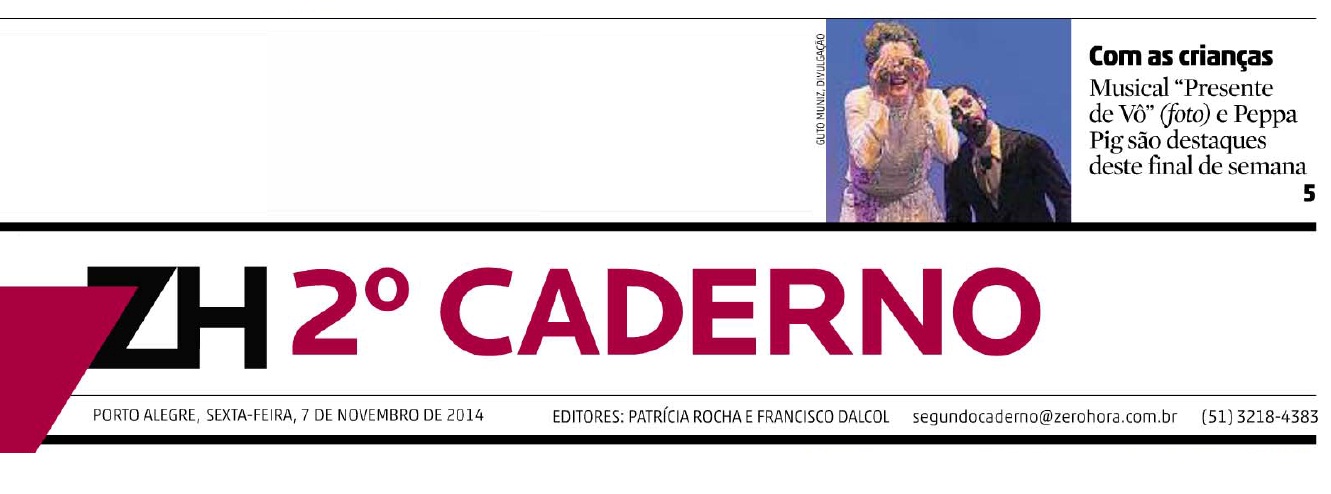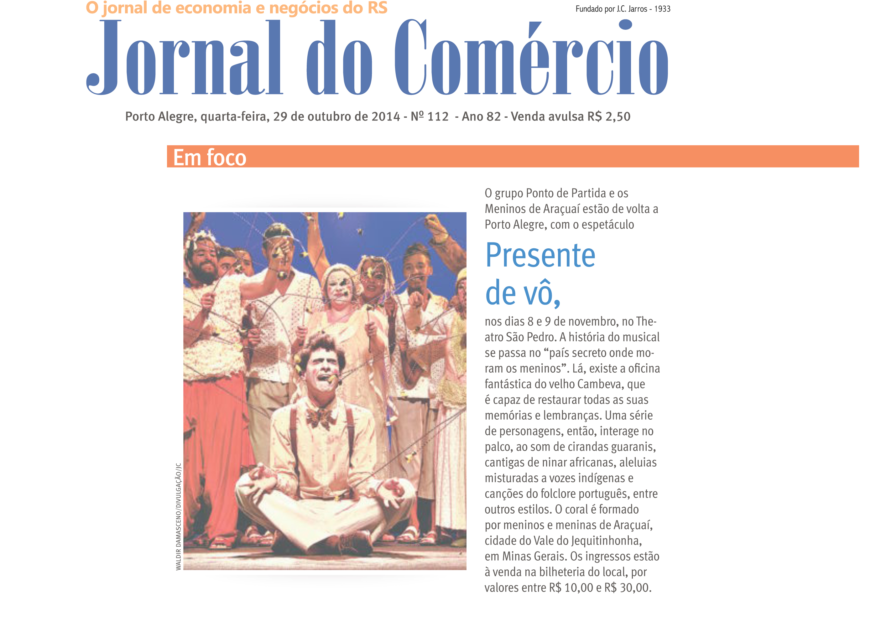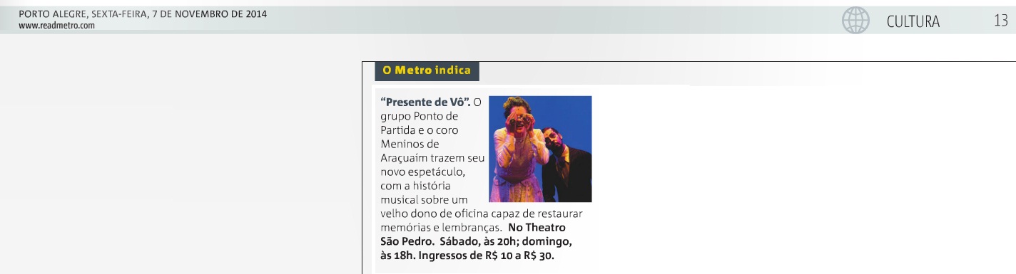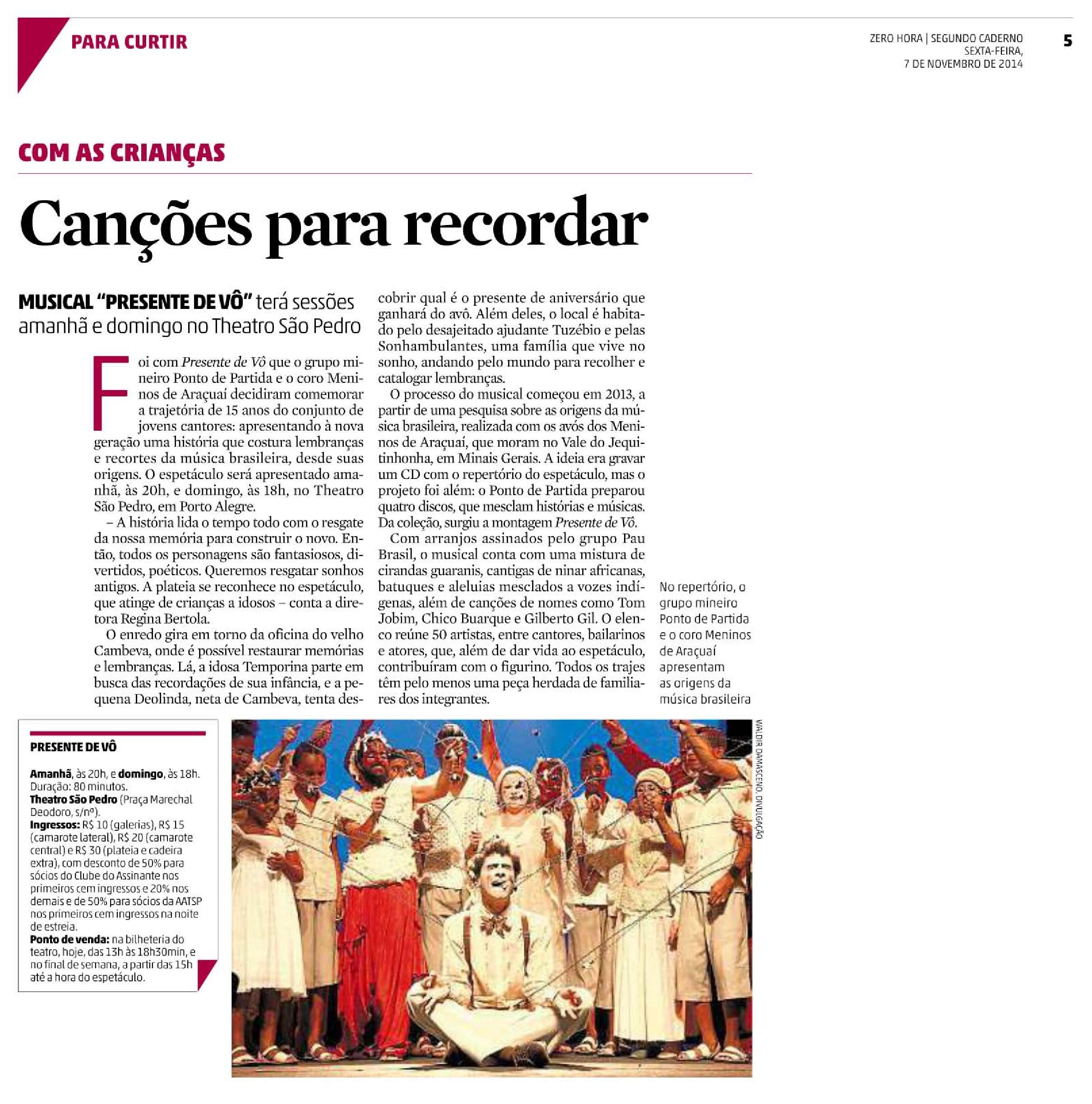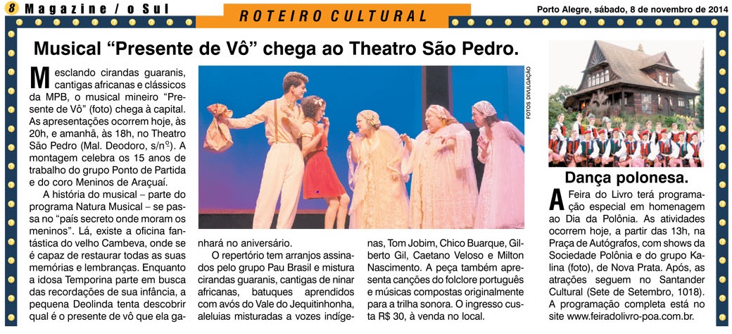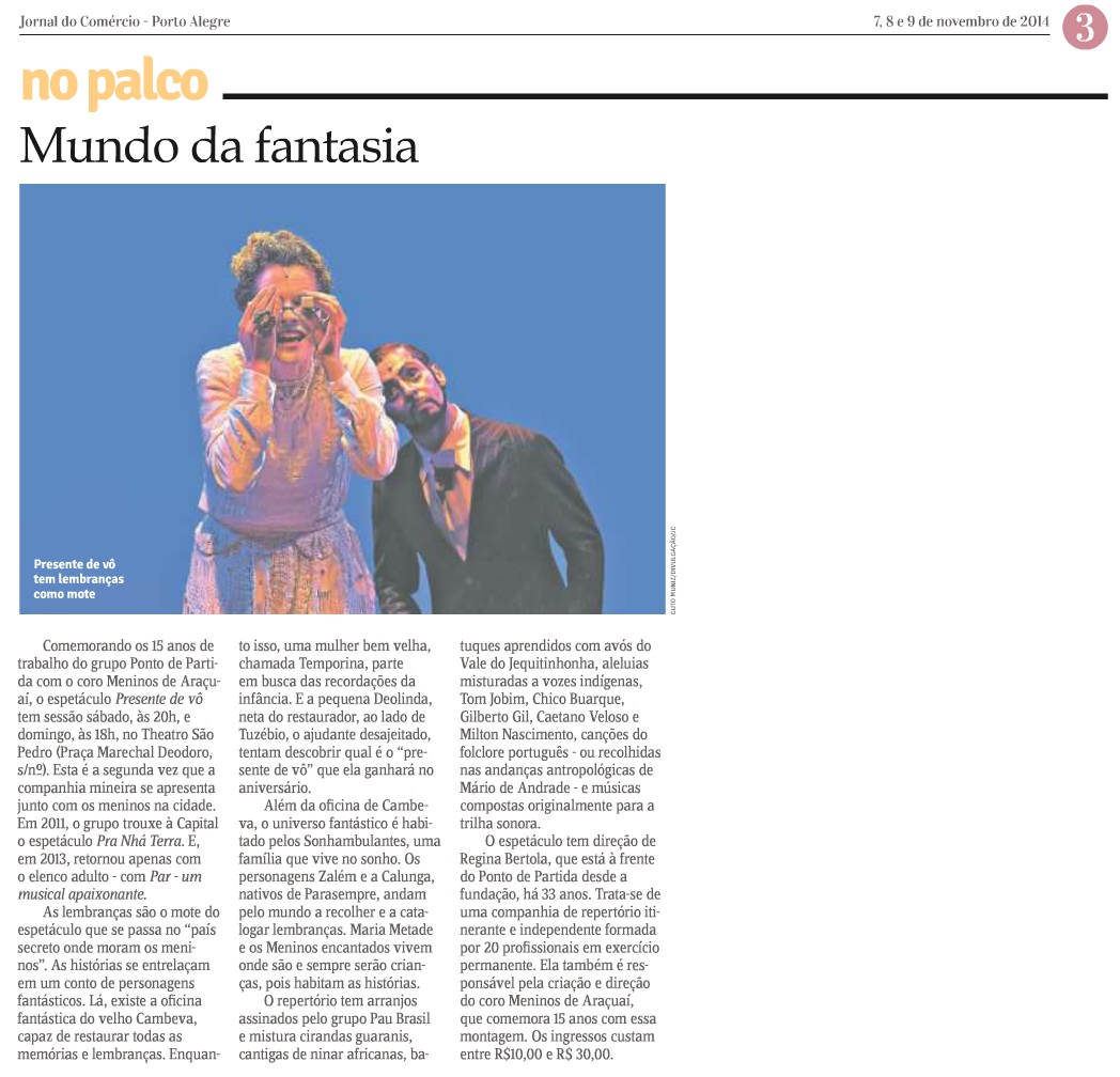 Comemorando os 15 anos de trabalho do grupo Ponto de Partida e o coro Meninos de Araçuaí, o espetáculo Presente de Vô chega a Porto Alegre nos dias 08 e 09 de novembro, no Theatro São Pedro, com patrocínio do programa Natura Musical. Esta é a segunda vez que a consagrada companhia mineira se apresenta junto com os Meninos na cidade. Em 2011, o grupo trouxe ao palco do São Pedro o espetáculo “Pra Nhá Terra”, encantando crianças e adultos. E, em 2013, retornou, apenas com o elenco adulto, com PAR – um musical apaixonante.