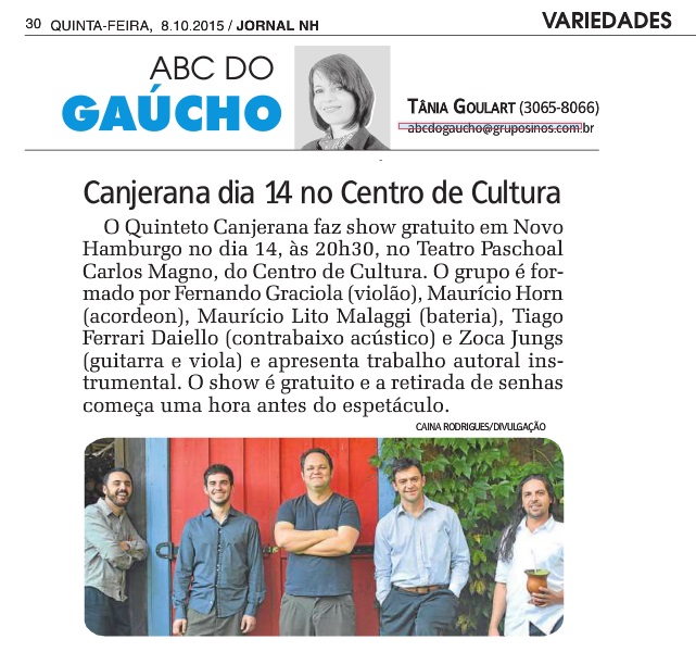 O Quinteto Canjerana é formado por Fernando Graciola (violão), Maurício Horn (acordeon), Maurício “Lito” Malaggi (bateria), Tiago Ferrari Daiello (gaúcho) (contrabaixo acústico) e Zoca Jungs (guitarra e viola) que apresentam um trabalho autoral instrumental contemporâneo das músicas nativista e folclórica gaúchas.