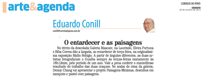 No térreo, a dupla Elvira T. Fortuna e Biba Corrêa apresenta a exposição Rádio Relógio. Dois pontos de vista, um só instante. Durante o período de um ano, as artistas, conectadas pelo tempo, registraram o Guaíba, a partir de ângulos diferentes no mesmo exato instante, às 18h12 de todas as terças feiras. Quem não parou em frente a um rádio relógio aguardando a troca repentina dos caracteres, registrando a mudança com um simples piscar de olhos? Com sua múltipla funcionalidade, da sonorização do ambiente ao despertador, essa peça de design que marcou a década de 80 serve de inspiração como suporte dos registros de tempo de Elvira e Biba.