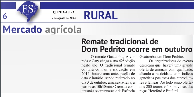 A Estância Guatambu consagrou-se no último sábado, 15 de outubro, a grande campeã da 104ª Expofeira de Bagé, levando para casa 15 premiações na categoria animais rústicos, com destaque para os trios de touros rústicos P. Hereford e Braford. Esta é a primeira vez que uma mesma cabanha recebe as maiores premiações das duas raças durante o evento. Os animais estarão à venda nesta quinta-feira, 20 de outubro, na 44ª edição do Remate Guatambu, Alvorada e Caty, que ocorre na sede da estância, a partir das 14h, com transmissão ao vivo pelo Canal Rural.