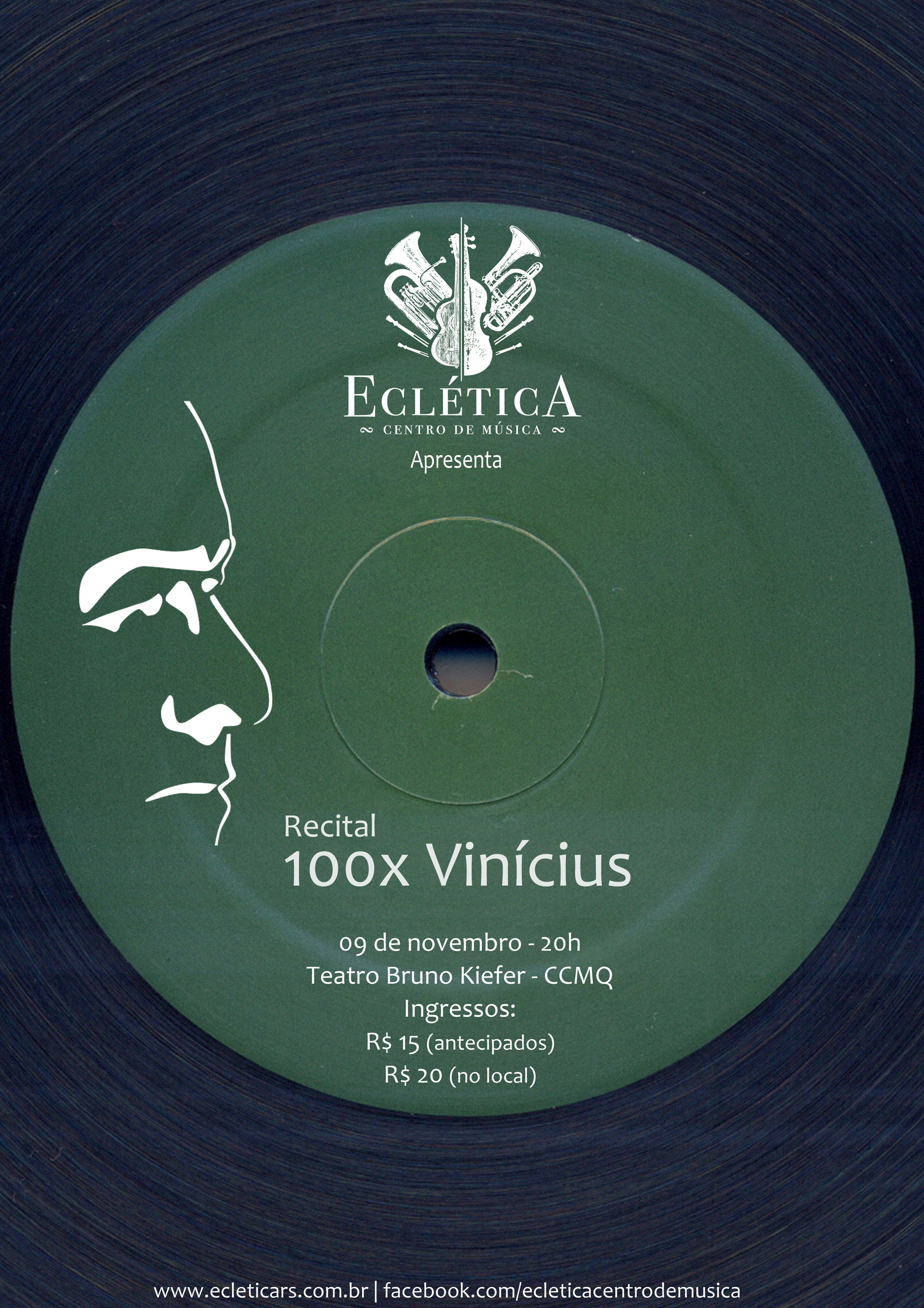 O espetáculo de fim de ano da escola de música Eclética fará uma homenagem ao centenário de Vinícius de Moraes. O evento, intitulado “100 X Vinicius” acontece no dia 09 de novembro, às 20h, na sala Bruno Kiefer, na Casa de Cultura Mario Quintana.