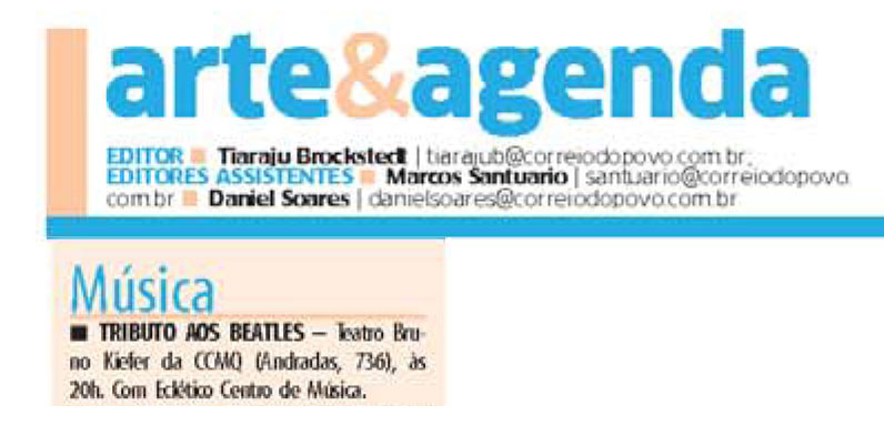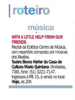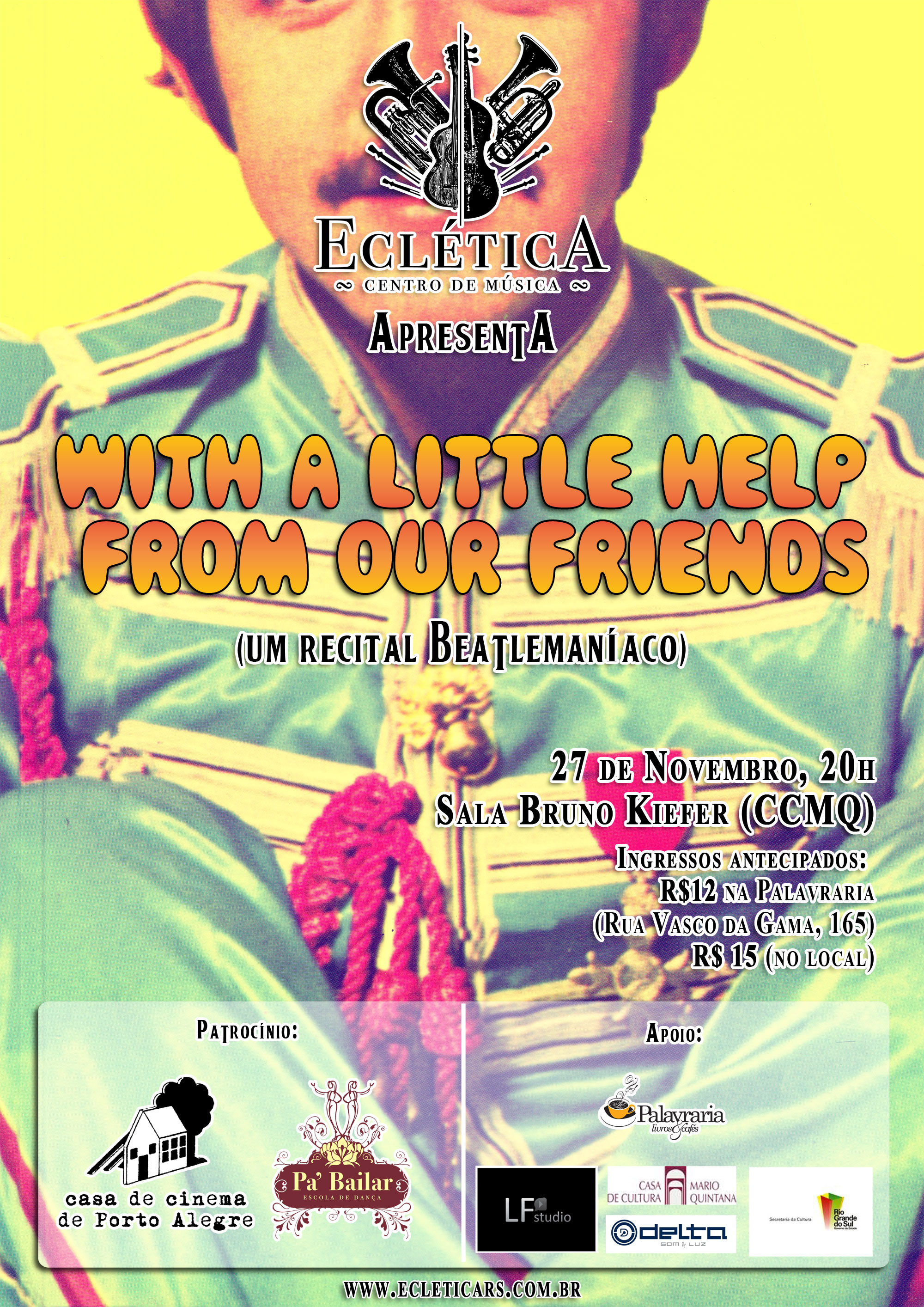 No dia 27 de novembro, às 20h, a Eclética – Centro de Música abre as portas da sala Bruno Kiefer, na Casa de Cultura Mario Quintana, para seu recital de final de ano. Com a proposta de um show de rock, a apresentação tem repertório composto por músicas da banda The Beatles. A escolha do tema tem a ver com os 50 anos de lançamento do primeiro single da banda, Love Me Do, e a chegada do baterista Ringo Starr, para substituir Pete Best.