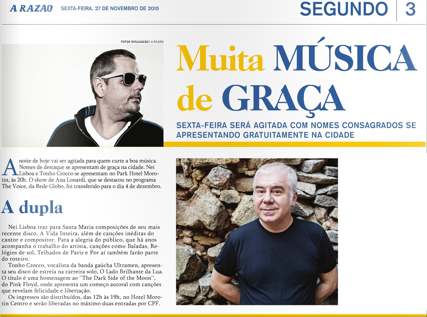 Nei Lisboa apresenta composições de seu mais recente disco, A vida inteira, além de canções inéditas do cantor e compositor. Para a alegria do público, que há anos acompanha o trabalho do artista, canções como Baladas, Relógios de sol, Telhados de Paris e Por aí também farão parte do roteiro. Tonho Crocco, vocalista da banda gaúcha Ultramen, apresenta seu disco de estreia na carreira solo, O Lado Brilhante da Lua. O título é uma homenagem ao ”The Dark Side of the Moon” do Pink Floyd, onde apresenta um começo autoral com canções que revelam felicidade e libertação.