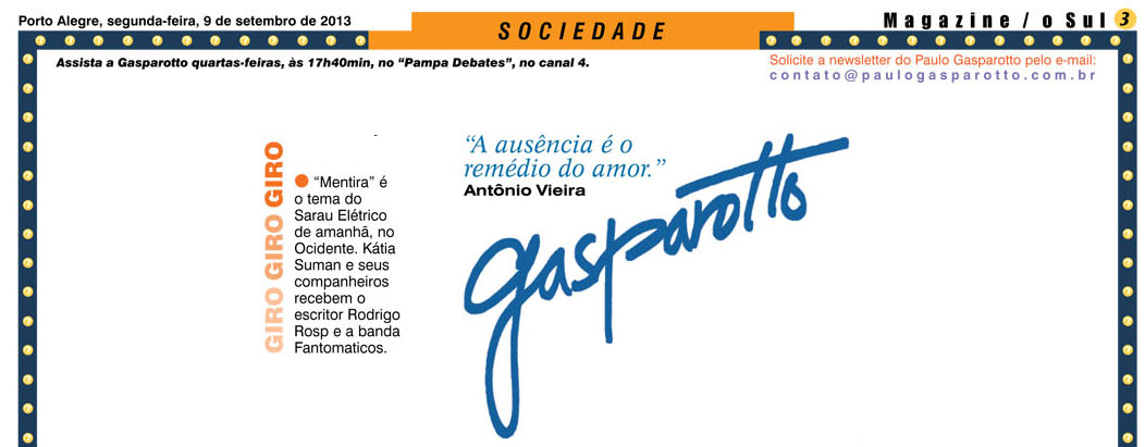 Acontece na próxima terça-feira, dia 10 de setembro, às 21h, o Sarau Elétrico no Ocidente, com o tema mentira. Claudia Tajes, Cláudio Moreno, Katia Suman e Luís Augusto Fischer recebem o escritor Rodrigo Rosp, que lançou em junho seu livro “Fingidores”, e a banda Fantomaticos, que divulga seu novo disco, “Dispersão”. Os ingressos à venda no local a R$ 15,00.