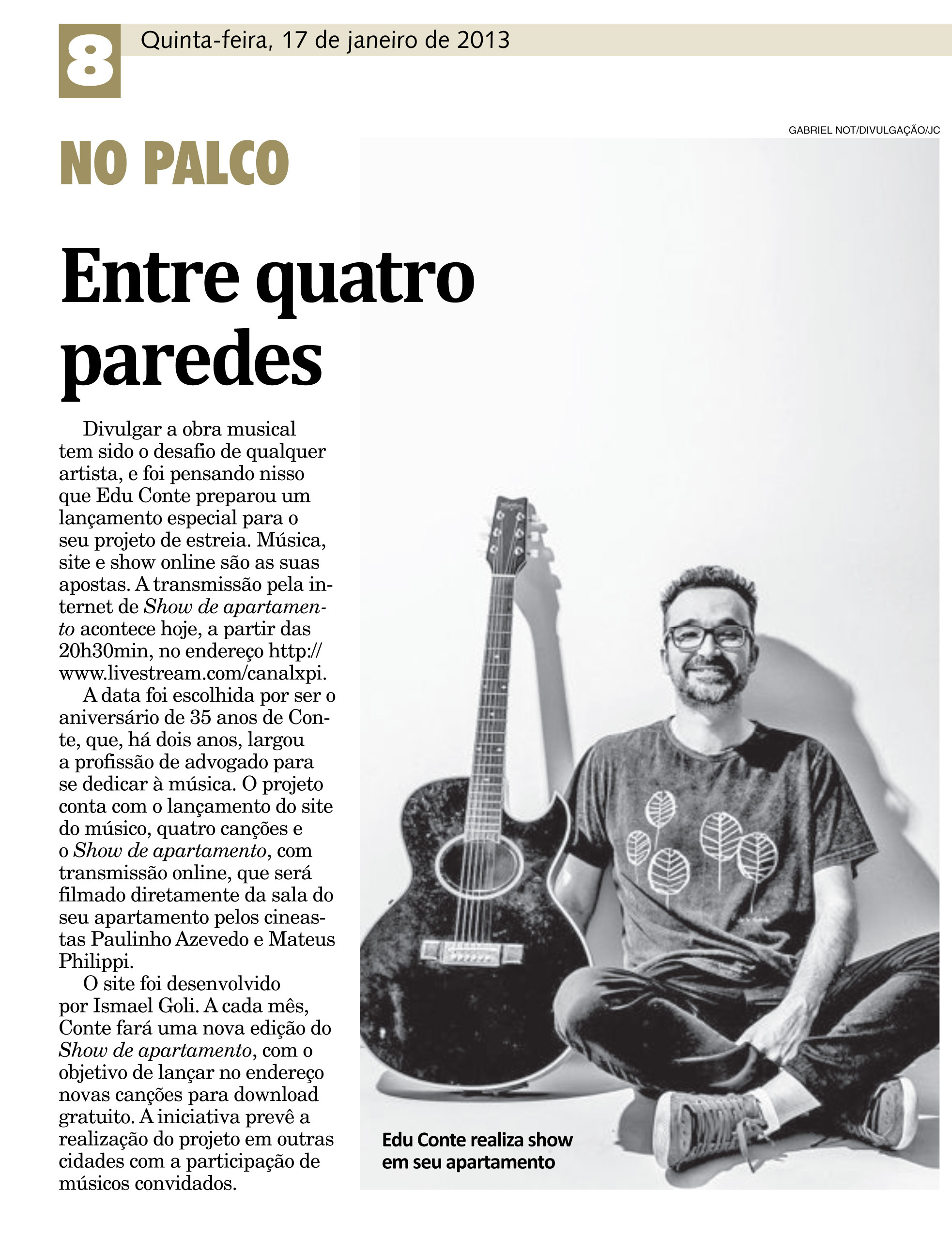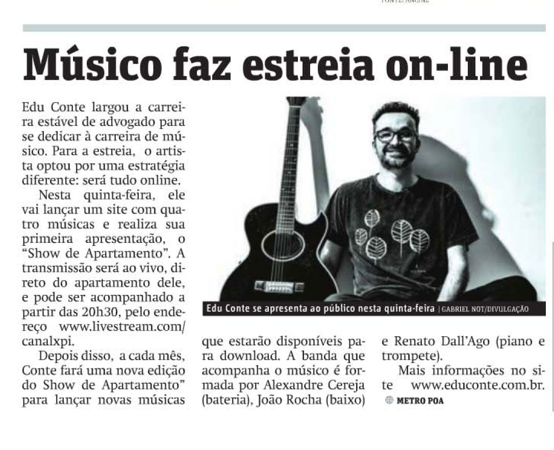 Edu Conte apresenta a segunda edição do Show de Apartamento na sala Bruno Kiefer da Casa de Cultura Mario Quintana na próxima terça-feira, dia 16 de abril, às 21h. O projeto teve sua primeira apresentação no dia 09, lotando a plateia do teatro.