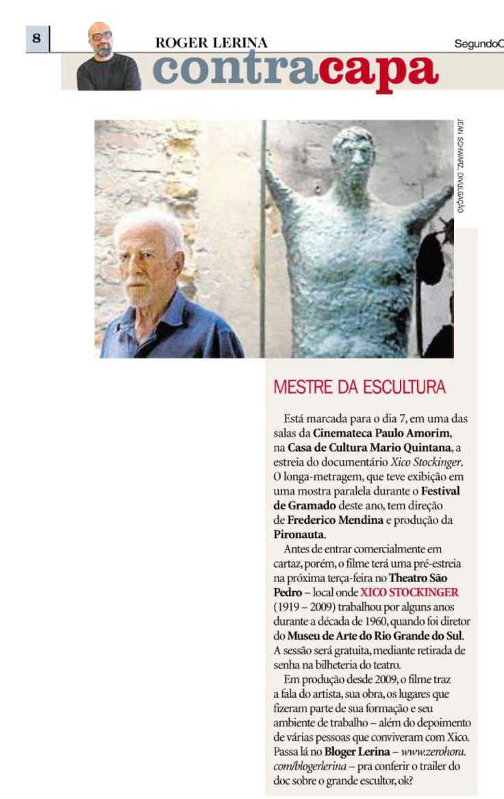 Primeira produção da Pironauta e estreia de Frederico Mendina na direção, o documentário Xico Stockinger estreia no dia 07 de dezembro na Cinemateca Paulo Amorim, na Casa de Cultura Mario Quintana. O longa metragem teve sua primeira exibição pública na Mostra Especial Cinema Gaúcho, durante a programação da 40ª edição do Festival de Gramado. Através de um olhar cuidadoso e delicado, o filme traz a fala do artista, sua obra, os lugares que fizeram parte de sua formação e seu ambiente de trabalho, além do depoimento de diversas pessoas de sua convivência ao longo de sua trajetória artística. O documentário cruza a carreira do artista com importantes fatos históricos apresentando, também, um pouco de sua vida como cidadão atuante na sua época.