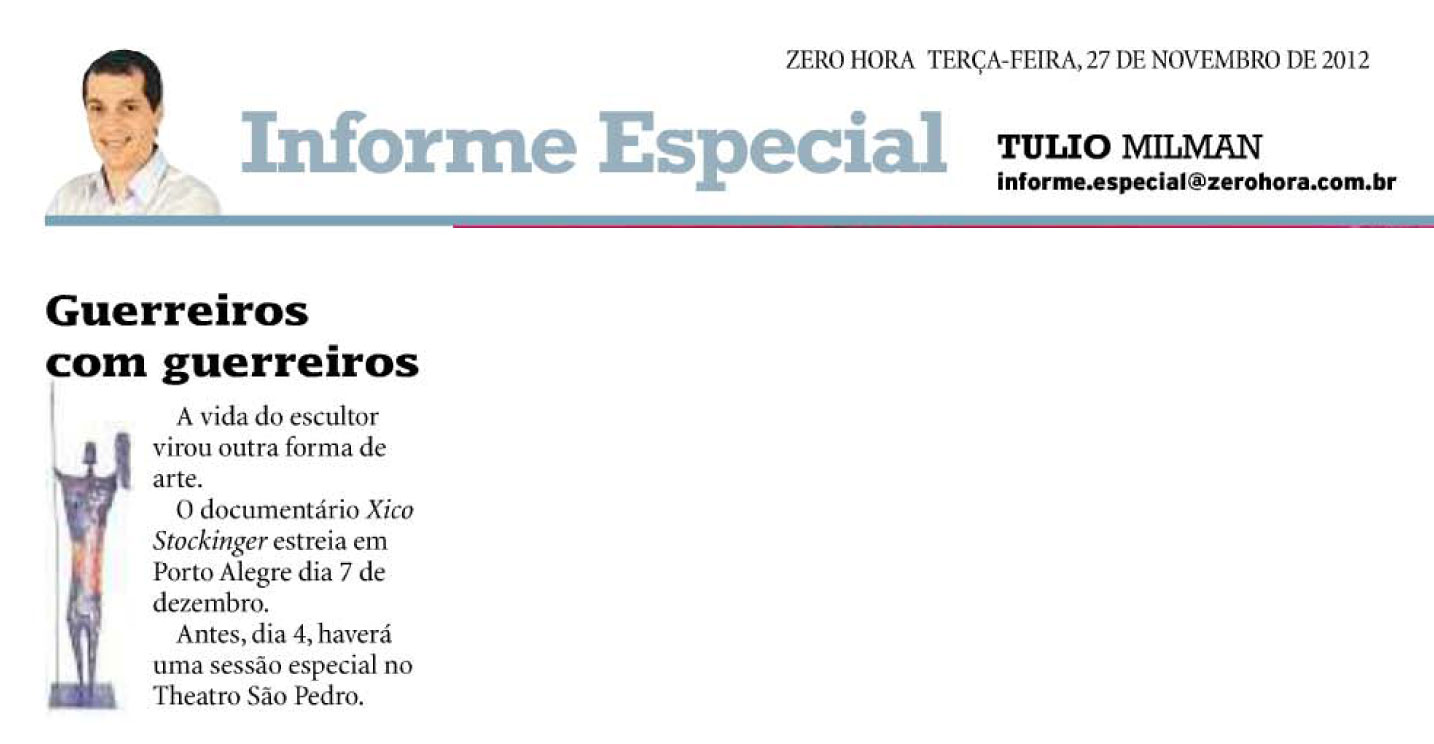 Primeira produção da Pironauta e estreia de Frederico Mendina na direção, o documentário Xico Stockinger estreia no dia 07 de dezembro na Cinemateca Paulo Amorim, na Casa de Cultura Mario Quintana. O longa metragem teve sua primeira exibição pública na Mostra Especial Cinema Gaúcho, durante a programação da 40ª edição do Festival de Gramado. Através de um olhar cuidadoso e delicado, o filme traz a fala do artista, sua obra, os lugares que fizeram parte de sua formação e seu ambiente de trabalho, além do depoimento de diversas pessoas de sua convivência ao longo de sua trajetória artística. O documentário cruza a carreira do artista com importantes fatos históricos apresentando, também, um pouco de sua vida como cidadão atuante na sua época.